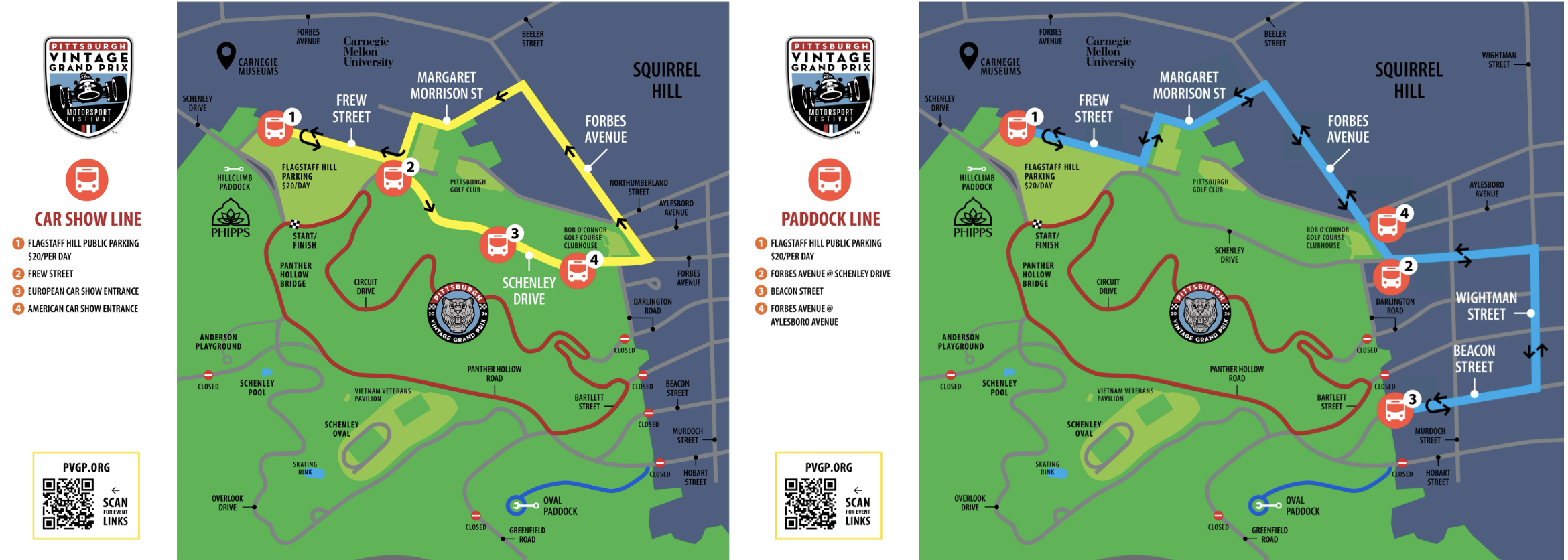 Here is a PVGP page dedicated to Maps, Road Closures & Detours for our event. The closures below reflect the traditional Schenley Park roads used for PVGP Race Weekend. PennDOT’s planned Parkway East closure for the Commercial Street Bridge project will create additional regional impacts that are not included here. We will share any event-specific updates as Race Weekend approaches.