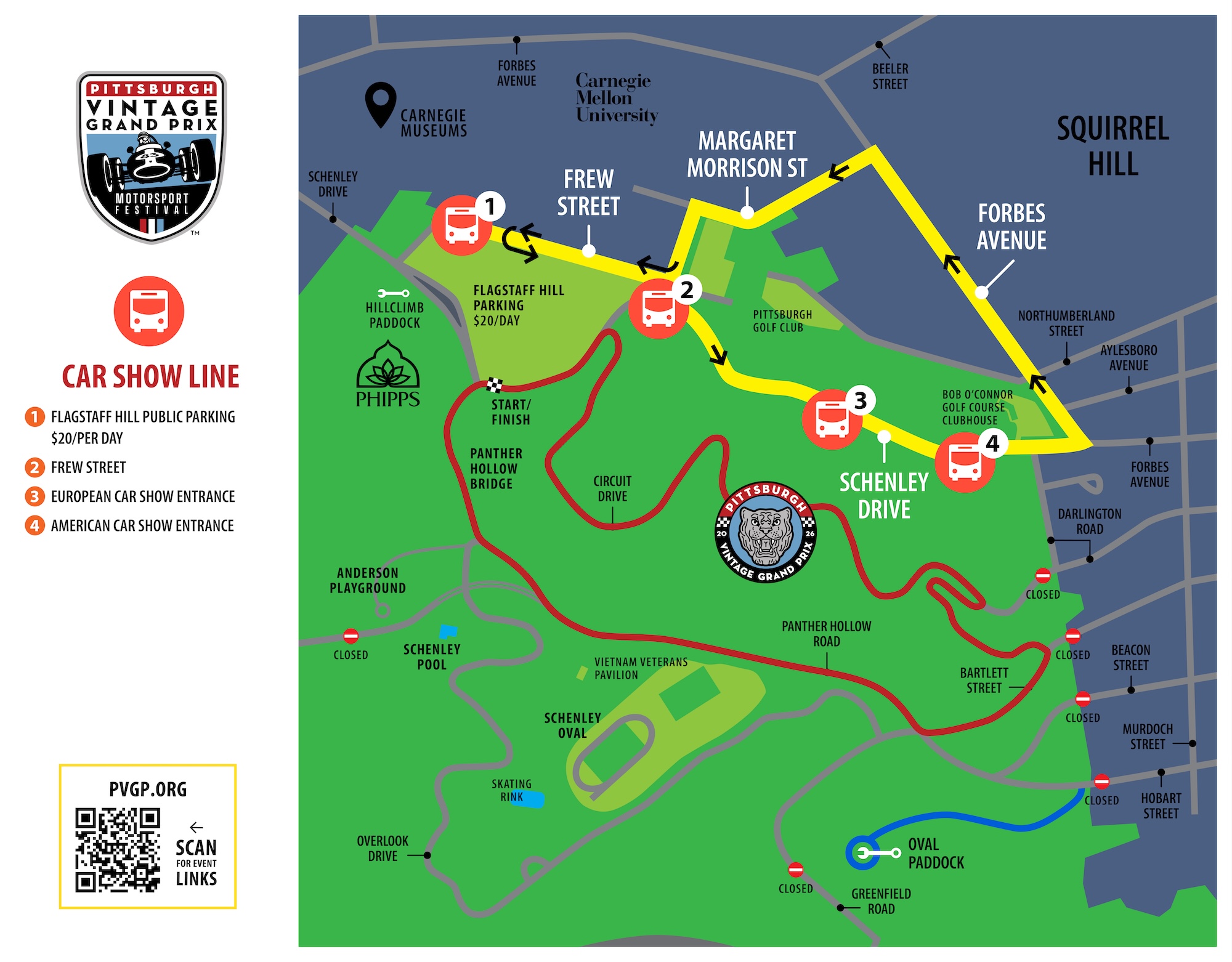 Free Shuttle Bus Route Map – transports you to the Car Show on the Bob O’Connor Golf Course at Schenley Park.