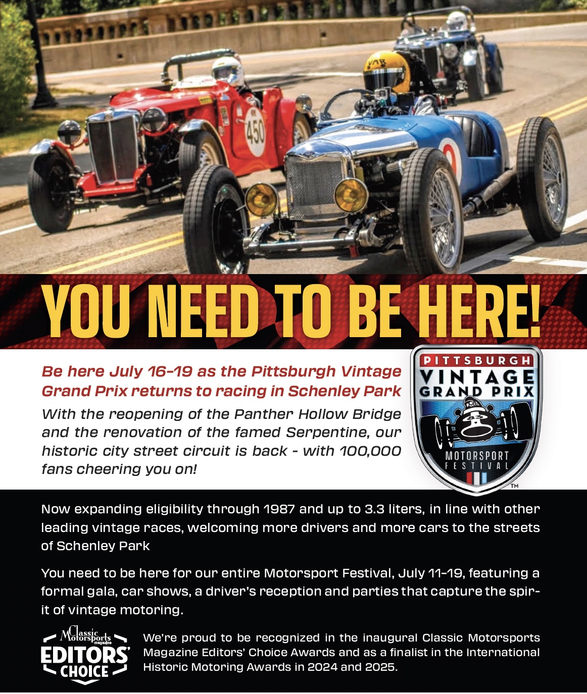 We sincerely appreciate everyone’s patience and support as we rerouted the circuit last year and staged a hillclimb. With the bridge reopening, we are excited to return to our world-famous course and restore the full Schenley Park racing experience.